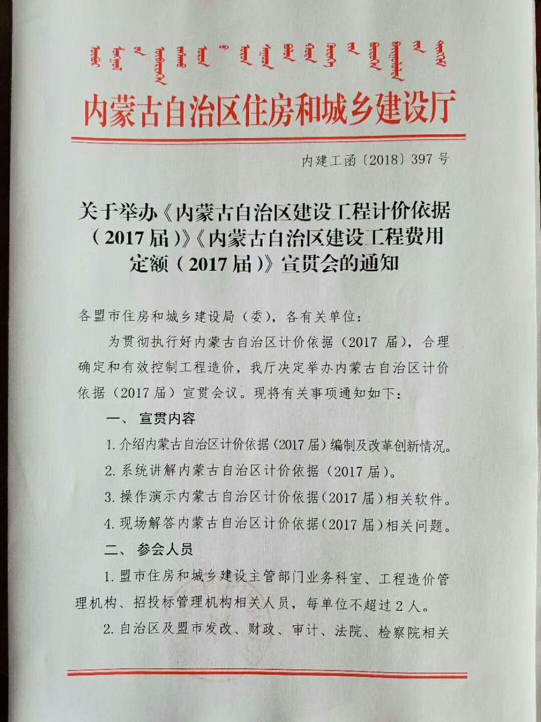 关于举办《内蒙古自治区建设工程计价依据》(2017届)《内蒙古自治区建设工程费用定额》(2017届)